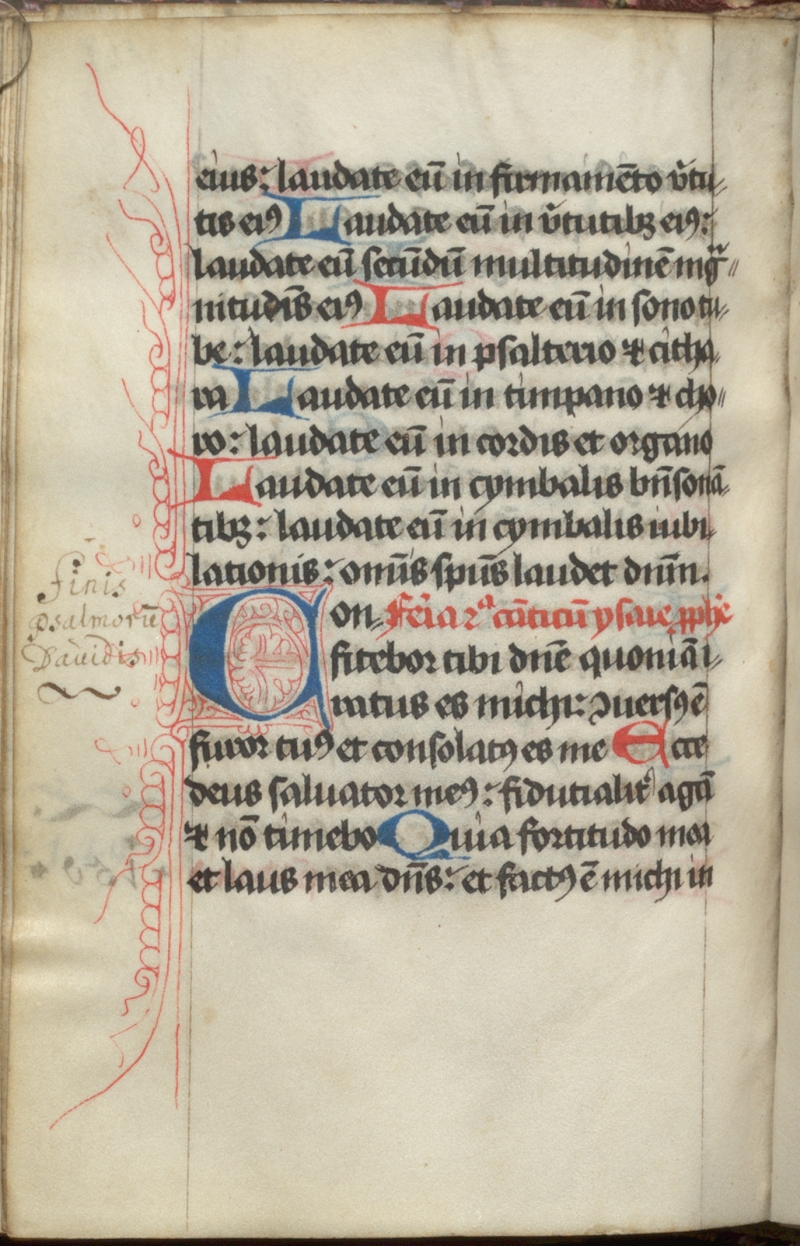 Die Datierung des Buchschmucks und mithin des gesamten Psalters auf die Zeit um 1460 ist allerdings schwieriger abzuleiten. Dickmann orientiert sich hierfür überwiegend an Vergleichsobjekten wie der sogenannten Arenberg-Bibel im Getty-Museum Los Angeles und an nachträglich illuminierten Bibeldrucken aus der Offizin von Fust und Schöffer. Die weiteren Zierinitialen – meist sind es dreizeilige Lombarden in Blau oder Rot mit Federschmuck in der Konträrfarbe – sind zwar hübsch anzusehen, tragen aufgrund ihrer weiten Verbreitung jedoch nicht zur Datierung der Handschrift bei (fol. 169v).